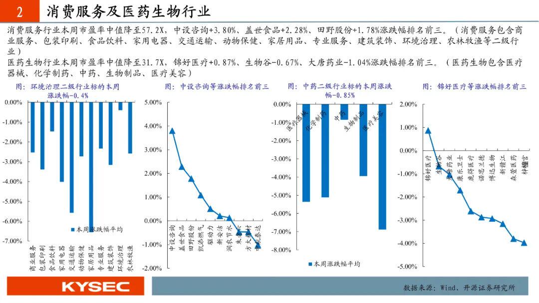 本周高端装备、信息技术、化工新材、消费服务、医药生物五大行业平均涨跌幅分别为-2.24%、-4.96%、-0.23%、-3.04%、-4.61%。高端装备行业本周市盈率中值降至40.7X,信息技术行业本周市盈率中值降至74.8X,化工新材行业本周市盈率中值升至44.7X,消费服务行业本周市盈率中值降至57.2X,医药生物行业本周市盈率中值降至31.7X。